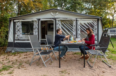 Im Vorzelt gibt es einen Gaskocher als Kochmöglichkeit, einen Kühlschrank, einen kleinen Grill sowie Gartenmöbel.